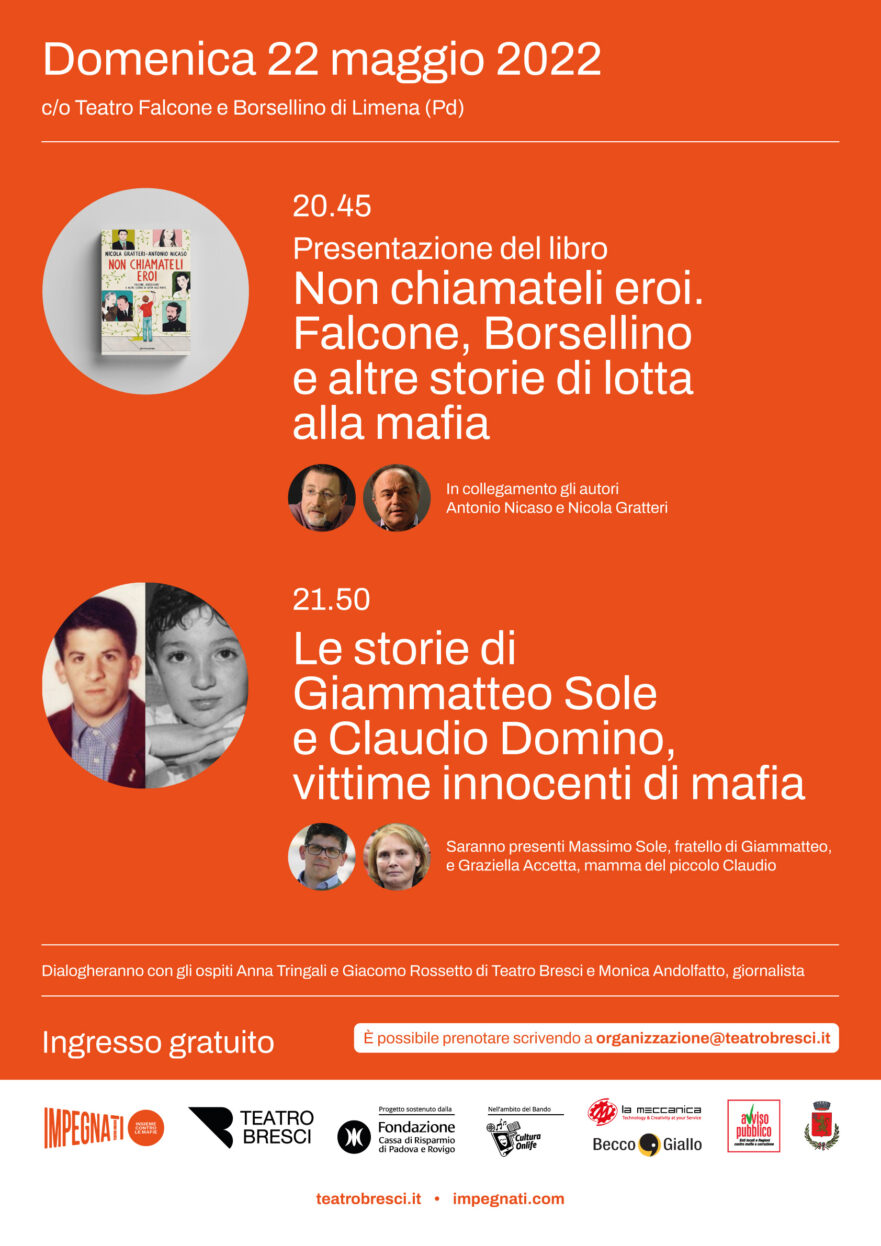 Ne parleranno gli stessi autori domenica 22 maggio 2022, alle 20.45 al Teatro di Limena (Pd), via Roma 44, ingresso gratuito, insieme a Massimo Sole, fratello di Gianmatteo e a Graziella Accetta, mamma di Claudio Domino, vittime innocenti di mafia a 24 e 11 anni, un ragazzo e un bambino.