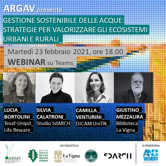 Si parlerà di “Gestione sostenibile delle acque: strategie per valorizzare gli ecosistemi urbani e rurali” martedì 23 febbraio alle ore 18:00 nella video conferenza mensile organizzata da Argav (Associazione regionale giornalisti agroambientali di Veneto e Trentino Alto Adige) in collaborazione, per l’occasione, con Laboratorio Spazi Rurali e Boschi Urbani-Vicenza, Biblioteca Internazionale “La Vigna”-Vicenza, Delegazione Veneto Pubblici Giardini.